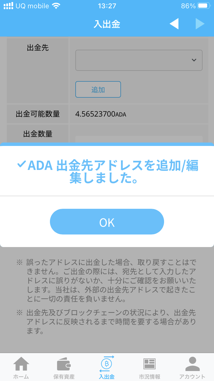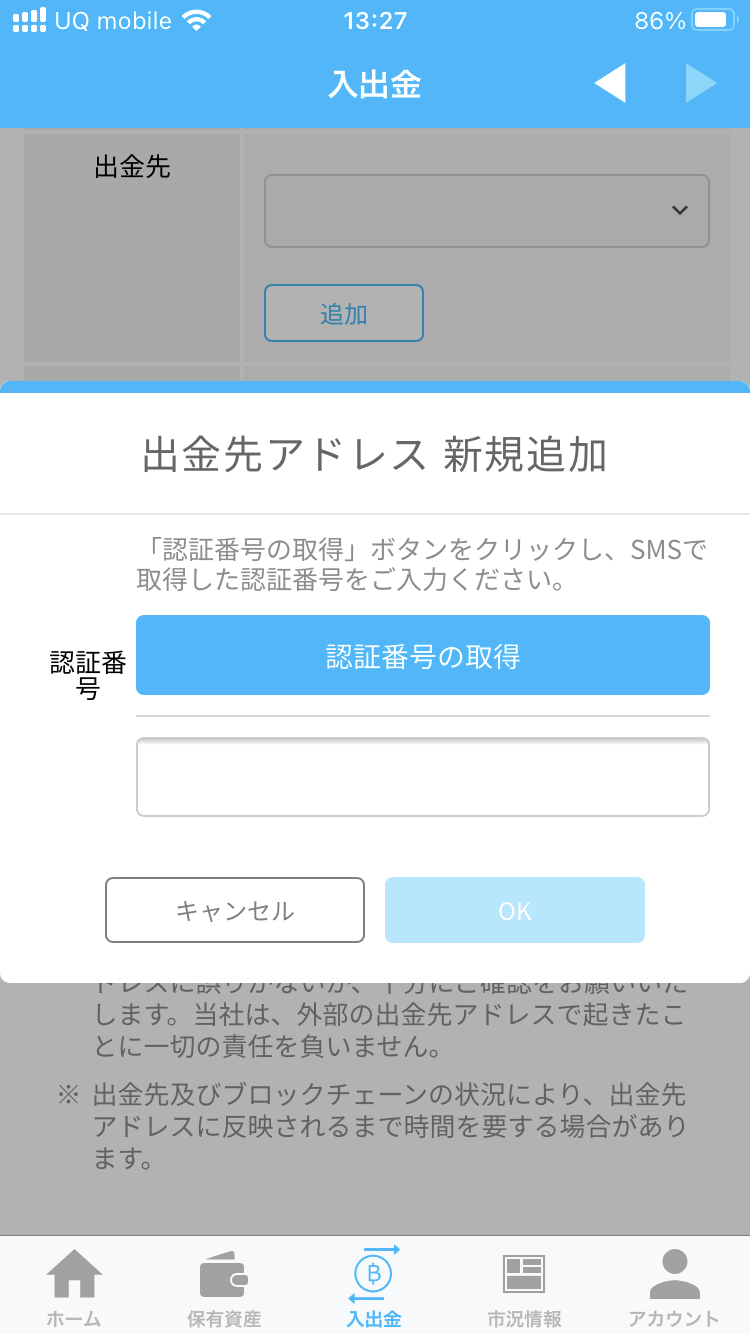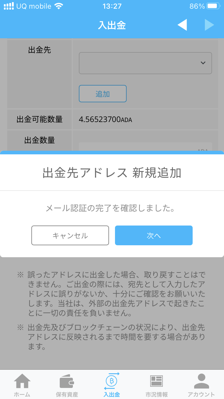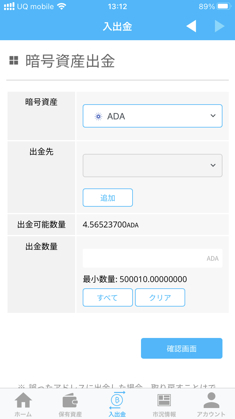 先ほど追加した出金先を選択し、出金数量を入力し、確認画面へ進む