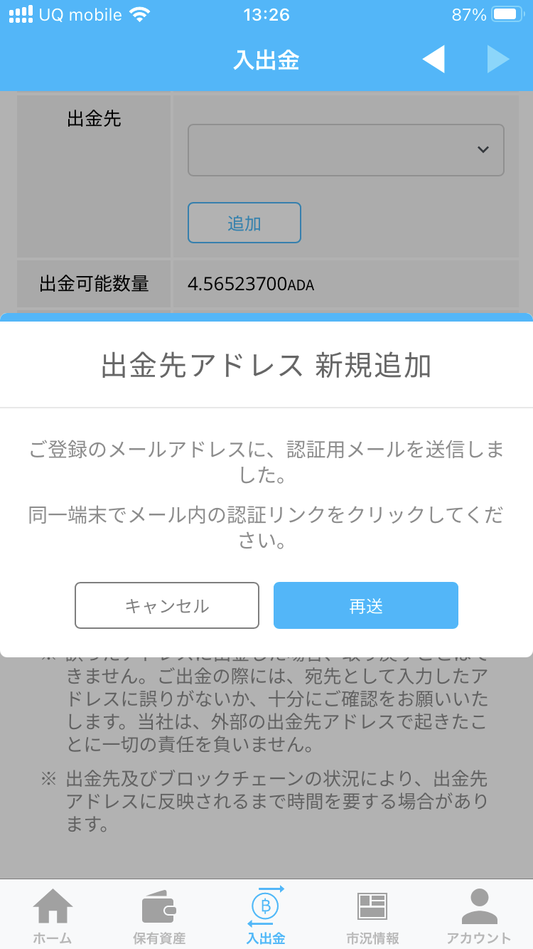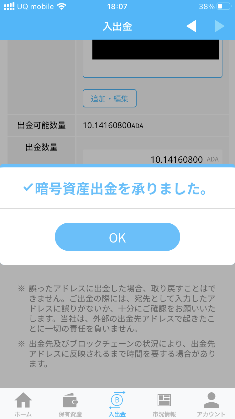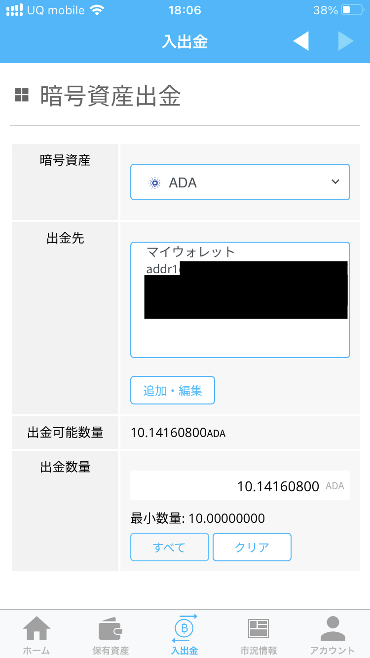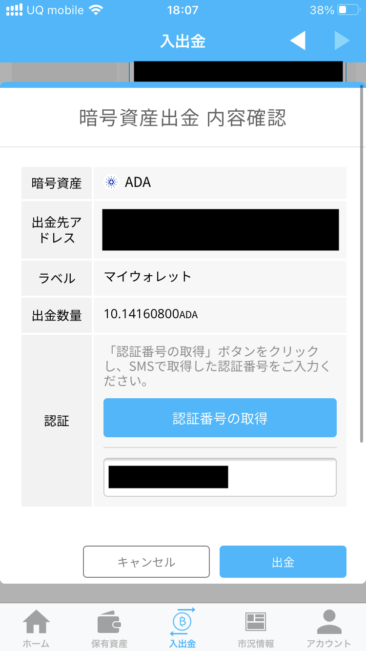 先ほど追加した出金先を選択し、出金数量を入力し、確認画面へ進む