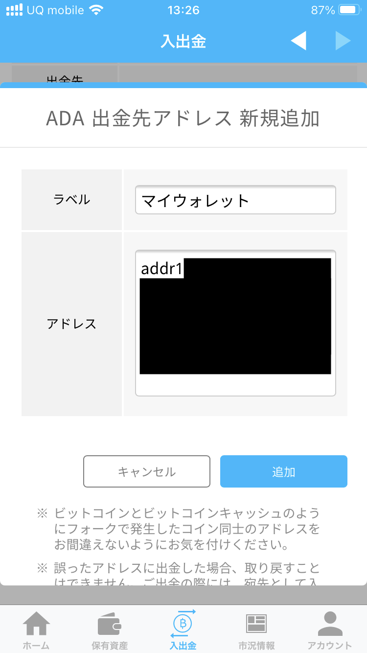 ラベルに適当な名前、アドレスに「ウォレットでコピーしたアドレス」を入力し追加