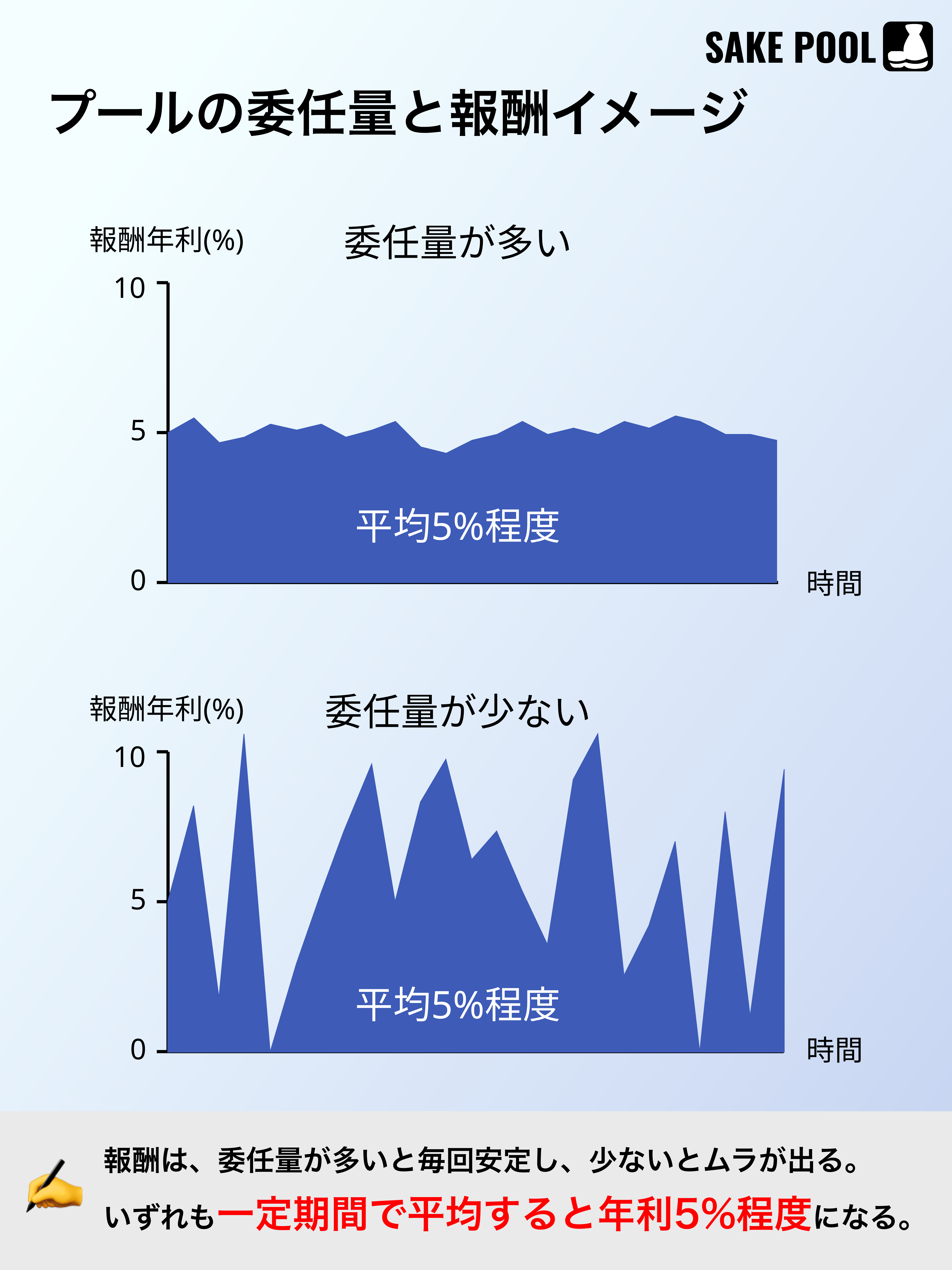 結論を言うと、委任量の多い少ないに関わらず、一定期間で平均すると年利5%程度に収束します。