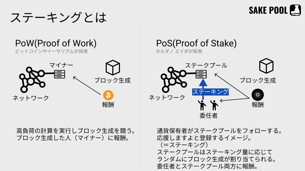 まずは通貨保有者がステークプール(=マイニングのマイナーと同義)をフォロー(=ステーキング)します。ステークプールはステーキング量に応じてランダムにブロック生成の権利が割り当てられます。そしてブロック生成したステークプールと委任者の両方に報酬が分配されます。これがステーキングの仕組みです。応援パワーを集めて、応援パワーが多いと報酬も多い、というような委任者とステークプール運営者のチーム戦のようなイメージですね。委任者とステークプールがWIN-WINの関係となる、サスティナブルな仕組みです。