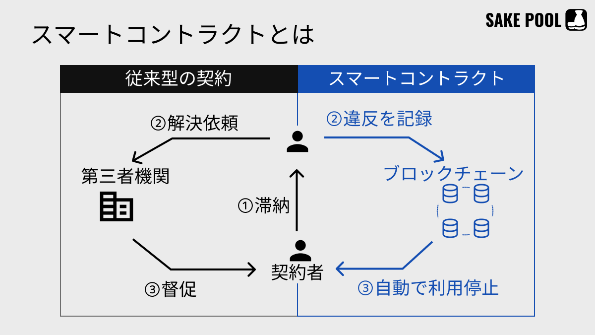 ブロックチェーン単体では取引データの記録を行うだけですが、スマートコントラクトにより契約実行を自動的に行うことが出来ます。